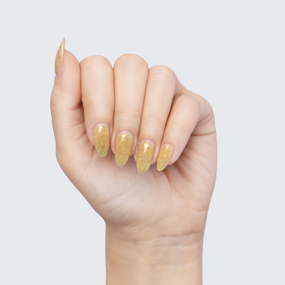 The gold, iridescent sparkle of this translucent polish is a treasure to behold.